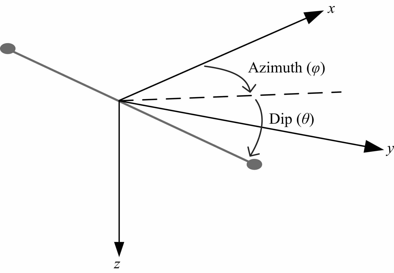 2.3 一次场计算——一维正演问题根据前文,一次电场与“剩余模型”电导率的乘积具有二次电场的场源电流密度的物理意义,出现在FD/FV离散线性方程的右端项中.由于一次场为人工场源在一维背景模型中激发的场,所以一次场的计算实际上是一维正演问题,并且只要在一次场计算中考虑到人工场源的方位、长度等,就可以实现同样的场源激发下的三维正演.对于全空间模型这种最简单的情况,电偶极子源激发的电磁场可以用纯解析公式求得(Ward and Hohmann, 1988);对于水平层状模型(包括半空间),需要使用Hankel变换来求贝塞尔函数的积分,属于“准解析”方法.在本文的三维正演代码的实现中,植入了开源的Dipole1D程序(Key,2009)作为一维正演的核心.Dipole1D程序基于电磁场的势的公式,允许发射电偶极子位于层状介质中的任意位置,并可为任意方位,同时可对点电偶极子沿发射导线方向进行线积分,从而获得有限长线源的电磁场.这里简要介绍一下任意方位的电偶极子和有限长线源这两个特征的实现.给定直角参考坐标系,假设偶极子朝y轴正向偏离x轴正向的角度为φ,朝z轴正向偏离水平面的角度为θ,偶极矩为m,如图 3所示.