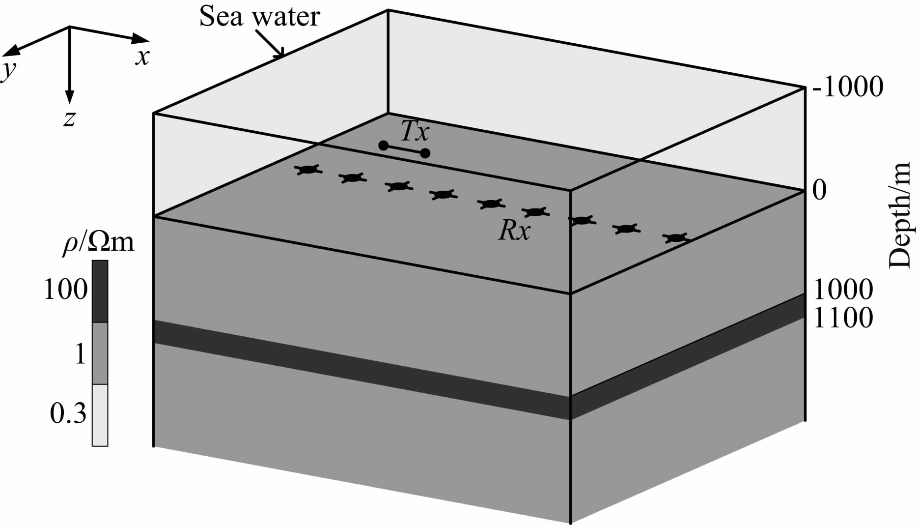 图 4 海洋油气储层层状模型以及一个典型的海洋CSEM施工示意图Fig. 4 The 1D layered reservoir model and a typical marine CSEM survey geometry |