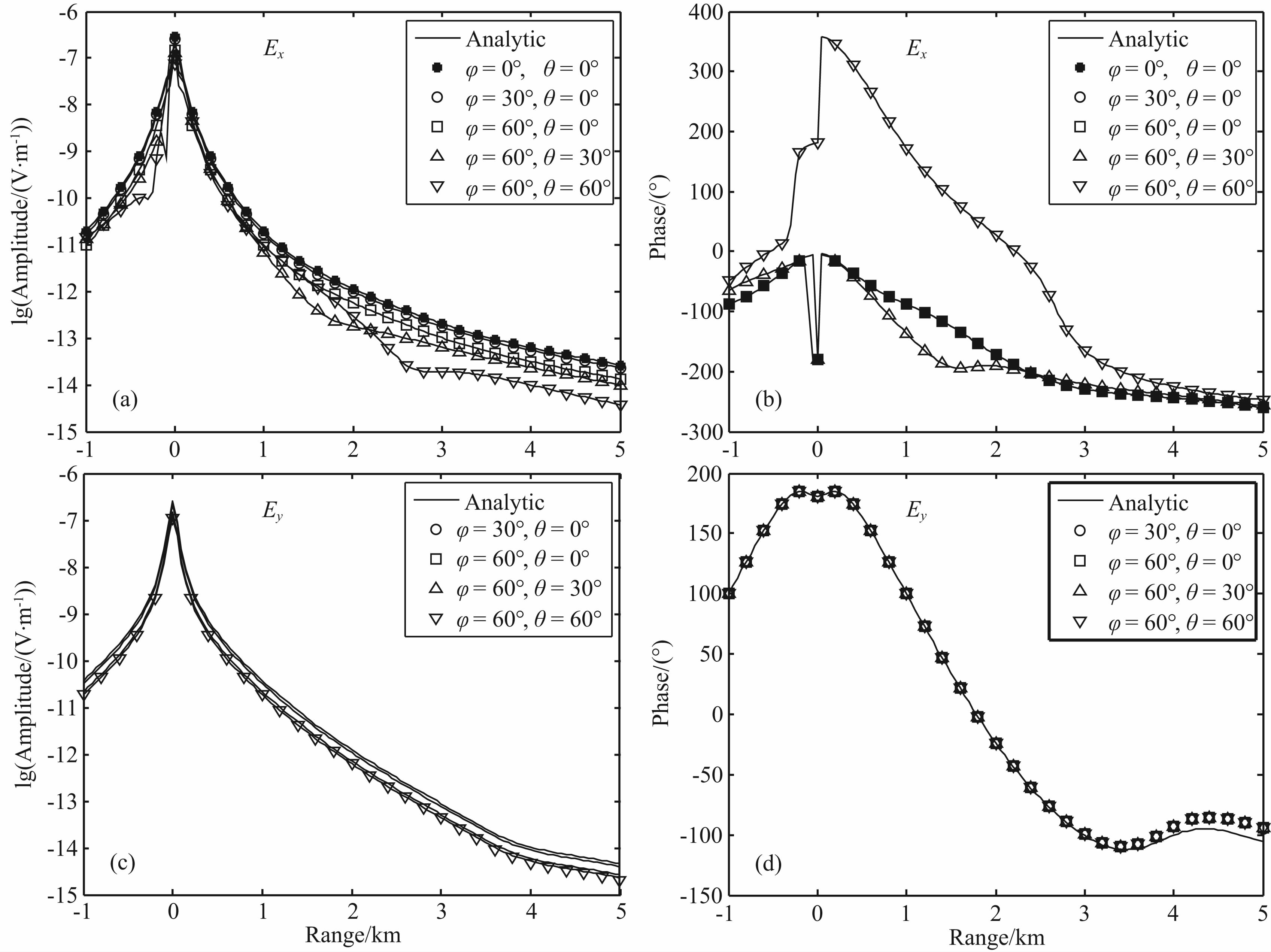 图 5 不同方位的点电偶极子在图 4所示的层状模型上激发的水平电场的FV三维数值解(符号)与Dipole1D解析解(线条)对比Fig. 5 Horizontal electric fields for the layered model shown in Fig. 4,FV solution(symbols) and the Dipole1D analytic solution(lines)for a point dipole source with different orientations |