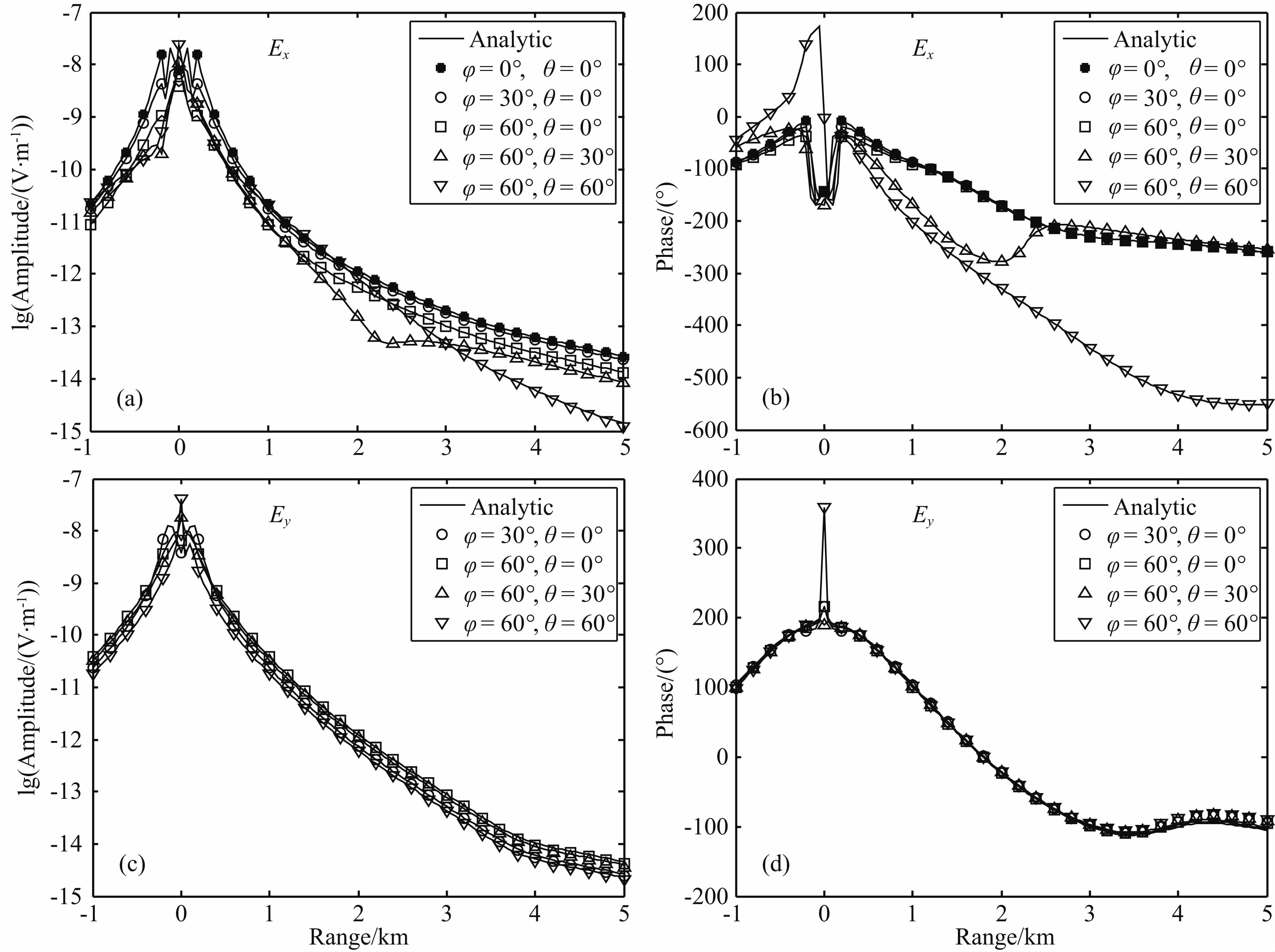 由于接收器沿x方向布设且与发射偶极的中 心共线,根据电偶极子场的特征(Constable and Weiss, 2006,Figure 2),x方向的偶极矩在测线上(此时为inline观测)激发的一次电场主要为x分量和z分量,y分量极微弱;y方向的偶极矩在测线上(此时为broadside观测)激发的一次电场主要为y分量,x分量和z分量极微弱;z方向的偶极矩在测线上激发的一次电场主要为x分量和z分量,y分量极微弱.因此,单独看图 5a—5d中偶极子在水平面内旋转时(仅φ变化)3个不同方位的电磁场,当偶极子从x轴逐渐向y轴旋转时,电偶极矩在x方向的投影越来越小,使得主要由x方向偶极矩产生的Ex分量振幅逐渐减小,直到偶极子完全处于y方向时(φ=90°)将会消失;相反,电偶极矩在y方向的投影越来越大,使得主要由y方向偶极矩产生的Ey分量振幅逐渐增强,直到偶极子完全处于y方向时将达到最大.但这3个方位的电场相位是重合的,这是因为此时Ex和Ey都只主要由某个单一方向的偶极矩产生,φ的改变只是改变了各自方向的偶极矩的幅度,导致电场的实部和虚部等比例地改变,并不影响复数电场的相位.若单独看偶极子在垂直面内旋转时(仅θ变化)3个不同方位的电磁场,可以发现当偶极子从水平方向逐渐向垂直方向旋转时,电偶极矩的水平分量越来越小,y分量越来越小,导致Ey振幅逐渐减小,直到偶极子完全垂直时(θ=90°)将会消失,但相位不会改变;而Ex的振幅不会随θ的变化而单向变化,且θ变化时相位也会改变,这是因为当θ>0°时偶极矩产生了z分量,Ex是偶极矩的x分量和z分量共同作用的结果,θ的增大会导致前者减小而后者增大,Ex的实部和虚部不会简单地单向且等比例变化.