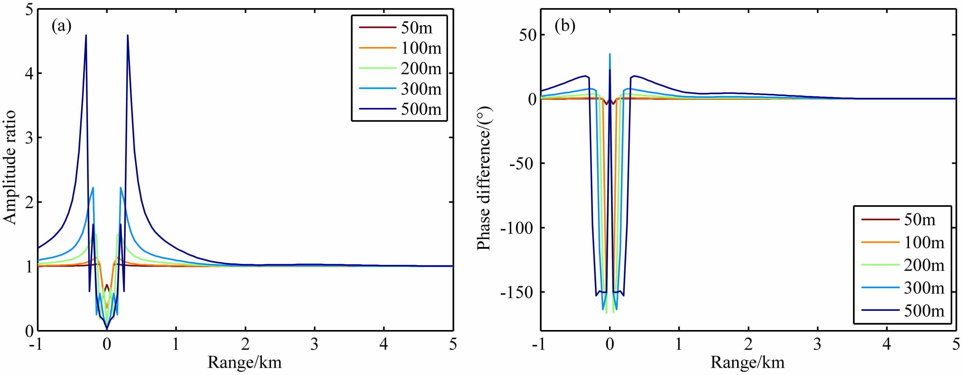 图 9 三维储层模型的储层截面边长变化时的Ex振幅(a)及相位(b)曲线Fig. 9(a)Ex amplitude and (b)phase for the 3D reservoir model shown in Fig. 8, with various horizontal edge of the reservoir |