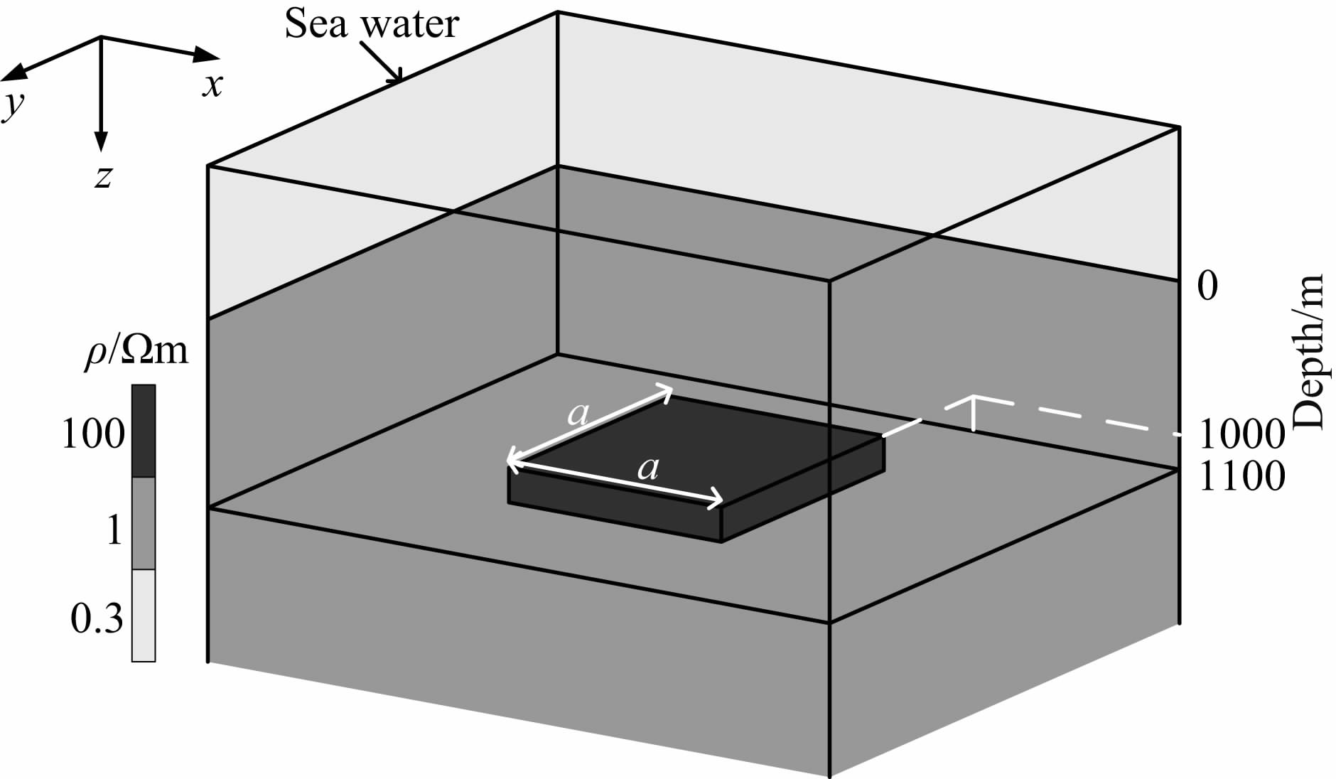 在第3节层状模型的基础上,将高阻储层在水平方向的边界截断,则得到更接近真实情况的三维油气储层模型,如图 8所示. 类似的模型曾被多次研究(Constable and Weiss, 2006;Weiss and Constable, 2006;Streich,2009),这些作者均使高阻体在x-y平面内的截面为圆形.为了避免模拟弧形边界导致的大量网格,这里让高阻体在x-y平面内的截面为正方形.