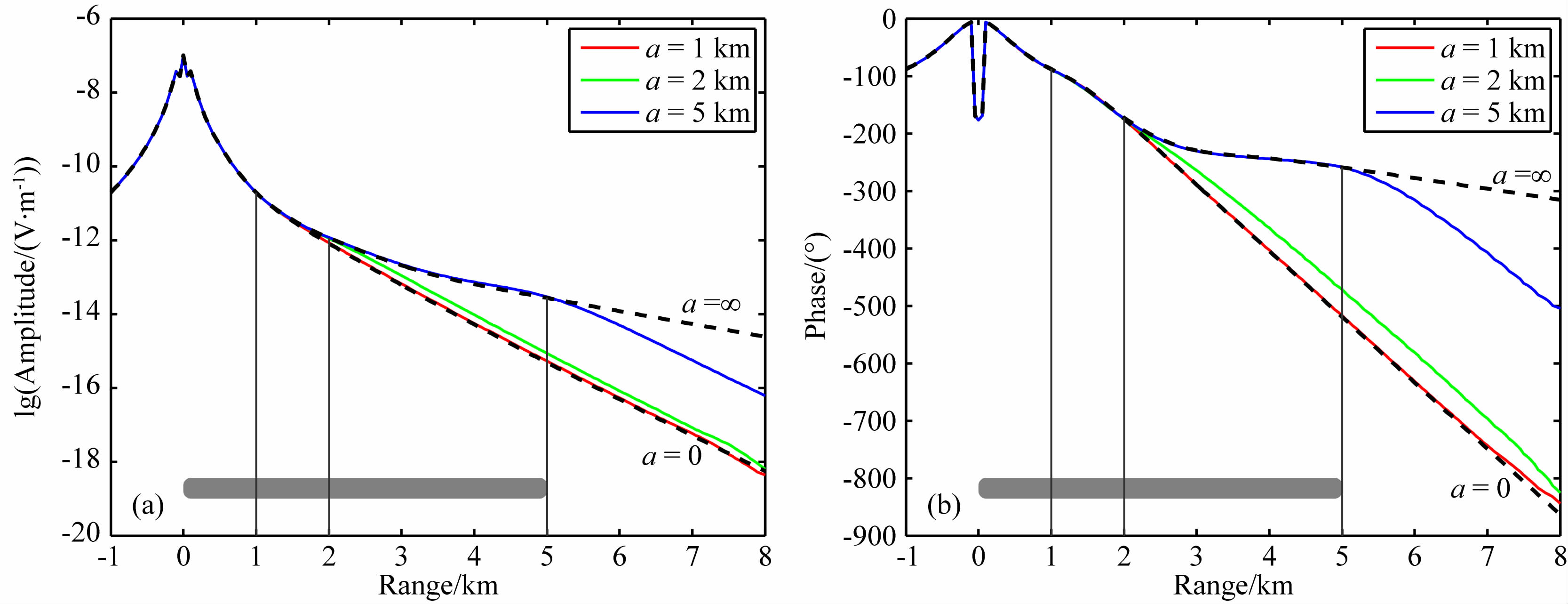可以看出,在小收发距(r<1 km)内,经海水传 播的直达波能量占主导地位,地层几乎毫无影响,电磁场振幅大约按1/r3衰减,类似于陆地CSEM中的“近场效应”;随着收发距的增大,电磁波在海水中大大衰减,地层波开始起主导作用,含高阻层(a>0)与不含高阻层(a=0)的电磁场逐渐区分开来,前者幅值更强,这是由于电磁波在地层中发生了长距离折射,折射波在高阻介质中衰减较慢而在低阻介质中衰减较快;电磁场曲线在对数坐标系中的斜率趋于常数,说明电磁场趋于按指数衰减,衰减因子取决于折射层电阻率.a=1 km与半空间模型的电磁场曲线几乎重合,说明该尺寸的异常体难以分辨;a= 2 km与半空间的电磁场虽然在大收发距时的衰减 速度保持一致,但二者的绝对差值较为明显,说明该尺寸的异常体容易分辨;a=5 km与半空间的电磁场差别非常明显,且在收发距大于高阻体边长时与高阻体无限延伸(a=∞)的电磁场区分开来,衰减速度逐渐趋于半空间的衰减速度.