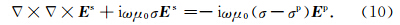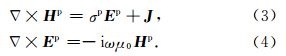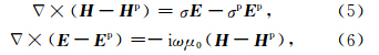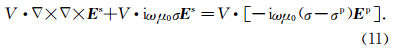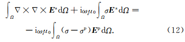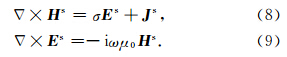 若将所计算模型的场(总场)看作参考模型所产生的一次场(primary field)与“剩余模型”所产生的二次场之和,即令二次场Hs=H-Hp,E s=E-Ep;将式(7)右端第二项看作激发二次场的电流密度,即令Js=(σ-σp)E p,则可将式(6)和式(7)写成二次场方程的形式: