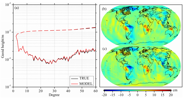 为验证解算策略的可行性,利用已经发布的2008年1月份CSR RL05模型作为真实模型,以GIF48作为参考模型加入2 cm轨道误差、1.0×10-4 m·s-1的速度误差、1.0×10-7 m·s-1的KBRR观测误差,不考虑其他误差,对真实模型进行重建.图 3a为重建重力场模型和真实模型的每阶大地水准面高(实线)和累计大地水准面高(虚线)对比,图 3(b、c)为以等效水柱高表示的真实模型与重建模型的质量异常的空间分布.在上述误差设置下,真实模型与重建模型的累计大地水准面差距60阶时相差约为0.04 mm,详见图 3a,质量异常的全球分布和强度相当,如图 3(b、c);上述误差设置造成的质量异常的误差也即真实模型与重建模型质量异常差异的标准偏差约为1.92 cm,最大(小)误差约 5.97(-5.6)cm.通过图 3的综合对比可以看出在该误差设置下能够基本恢复出原来的信号.