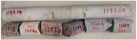 本研究采取了西科1A井1153.14~1267.5 m的所有代表性岩石标本(图 2)并制作薄片(图 3),以观察分 析 岩石矿物结构及矿物组成.由图 2可知,在1254.3~ 1259.6 m 共约5 m的深度内范围,也即基底与沉积盖层交界面附近,岩性变化很大.观察显示,XS1为含生物碎屑灰岩,XS2为含生物碎屑大理岩化灰岩,XS3为大理岩.限于篇幅,仅就基底岩石标本作以下详细分析.