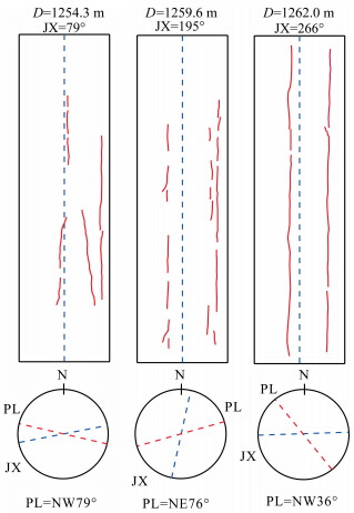 ![]() | 图 7 印模试验确定的最大水平主应力方向(JX代表基线,PL表示水压裂隙方向)Fig. 7 Maximum horizontal principal stress directions determined by impression tests(JX is baseline and PL is hydraulic fracture direction) |