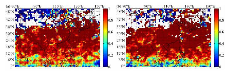 ![]() | 图 4 2007年夏季东亚区域深对流层发生频率(100%)(a:白天;b:夜间) Fig. 4 Occurrence frequency(100%)of deep convection events over East Asia from AIRS measurements in summer 2007(a: daytime; b: nighttime) |