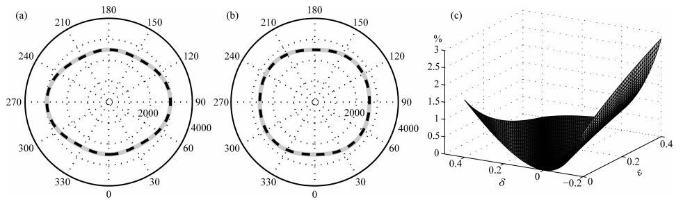 图 1 VTI介质弹性P波和声学近似纯P波的相速度曲线,以及两者之间的相对误差剖面. (a)各向异性参数ε=0.2,δ=-0.1;(b)各向异性参数ε=0.05,δ=0.3;(c)最大相对误差剖面图 1a和1b中黑色点线指示的是弹性P波速度曲线,灰色实线指示的是纯P波速度曲线 Fig. 1 Comparison of phase velocity between elastic wave equation(black dotted line) and pure P-wave equation(gray solid line):(a)anisotropy parameters ε=0.2,δ=-0.1;(b)anisotropy parameters ε=0.05,δ=0.3; (c)maximum relative error for a wide range of ε and δ |