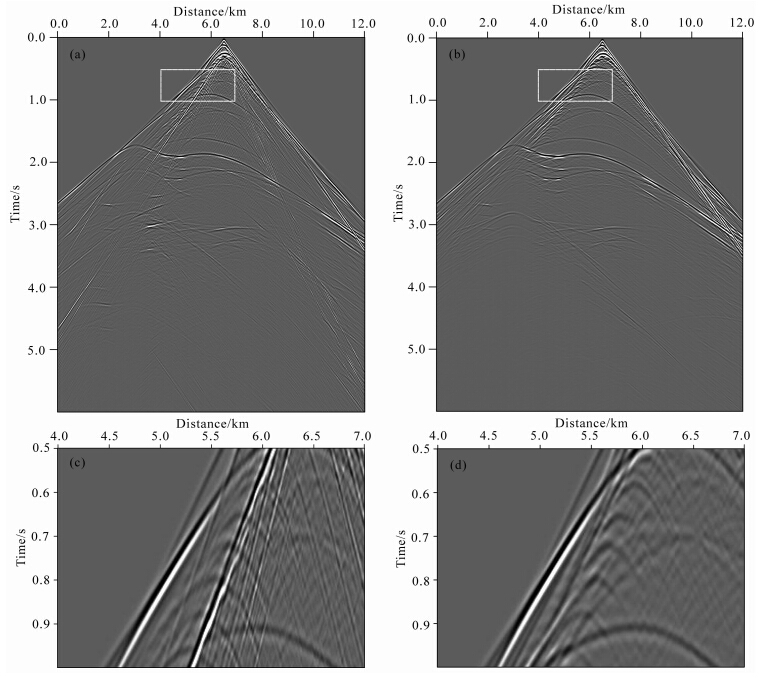 图 12 Hess模型不同方程正演模拟地震记录:(a)VTI介质弹性波方程正演结果;(b)VTI介质纯P波方程正演结果;(c)和(d)分别是(a)和(b)的矩形区域标出的部分Fig. 12 Shot gathers generated form Hess model:(a)Seismic profile with elastic wave equation;(b)Seismic profile with pure P-wave equation by using hybrid PS/SGFD scheme;(c)Zoom of rectangle area in(a);(d)Zoom of rectangle area in(b) |