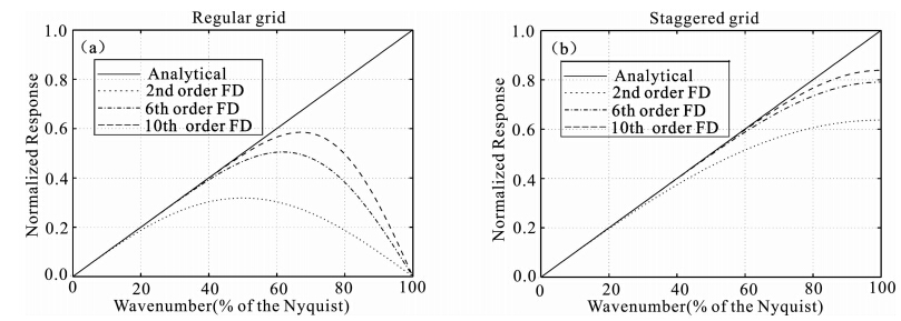 对于交错网格有限差分格式,从图 4b可以看出,当差分阶数提高时差分算子单调递增地逼近微分算子,即对2L阶交错网格有限差分,有