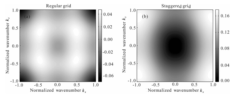 直接对(23)式和(24)式进行讨论是很困难的,因此我们首先对两种差分格式的频散关系进行了分析.图 4所示为不同阶数的差分算子在波数域的频散曲线,图 4a为中心规则网格有限差分算子对精确微分算子的逼近,图 4b为交错网格有限差分格式,横坐标是归一化波数,最大值为Nyquist波数.图 5是φ(kx,kz)在差分阶数为2阶,各向异性参数ε=0.3、δ=-0.1的特定介质下的数值模拟图,图 5a是采用中心规则网格有限差分计算出的数值解,图 5b是交错网格有限差分格式.从图 4a可以发现对于中心规则网格有限差分格式,不论取多少阶近似,在靠近Nyquist波数的区域,差分算子响应都接近为0.同时,又由于Lxz>0,而Km<0,因此当x和z方向同时取到Nyquist频率时,有φ(kx,kz)<0, 如图 5a所示,其中四个边角处的值均出现了小于零的情况.在计算过程中这部分高波数区域会引起计算溢出导致波场值呈指数增长,计算终止.因此在ε>δ的情况下不论取多少阶近似,直接联合伪谱法和中心规则网格有限差分法求解方程(6)都无法满足稳定性条件,在正演模拟过程中将出现严重的稳定性问题.
