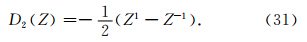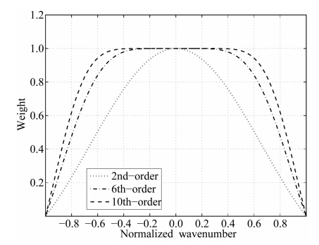 本文利用有限差分法和Z变换构造波数域窗函数(Yan and Sava, 2009).我们以二阶中心差分格式为例,说明窗函数的构造方法,对于二阶中心差分格式有如下的Z变换形式:
