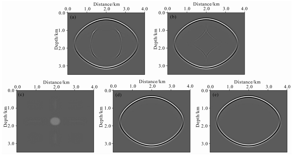 图 7 各向异性VTI介质(ε=0.2,δ=-0.05)波场快照:(a)弹性波场垂直分量;(b)各向异性声学近似方程模拟波场;(c)规则网格混合法求解纯P波方程波场;(e)伪谱算子滤波后规则网格混合法求解纯P波方程波场;(d)交错网格混合法求解纯P波方程波场 Fig. 7 Wavefield snapshots in a VTI medium with ε=0.2,δ=-0.05:(a)Vertical component synthesized by elastic wave equation;(b)Wavefield synthesized by anisotropic acoustic wave equation;(c)Wavefield synthesized by pure P-wave equation using hybrid PS/CFD scheme;(d)As for(c),except filtering the pseudo-differential operator;(d)As for(c), except using hybrid PS/SGFD scheme |