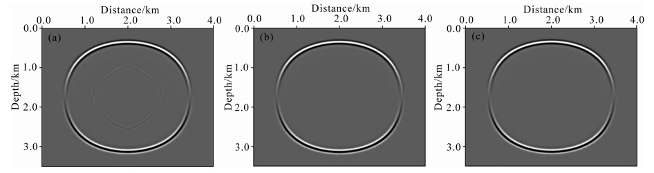 图 8 各向异性VTI介质(ε=0.05,δ=0.2)波场快照:(a)弹性波场垂直分量;(b)规则网格混合法求解纯P波方程波场;(c)交错网格混合法求解纯P波方程波场 Fig. 8 Wavefield modeling in a VTI medium with ε=0.05,δ=0.2:(a)Vertical component synthesized by elastic wave equation;(b)Wavefield synthesized by pure P-wave equation using hybrid PS/CFD scheme;(c)As for(b), except using hybrid PS/SGFD scheme |