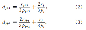 当同相轴信息较简单时,分别提取被动源记录虚拟炮点位置附近的若干道数据,提取这些道有效信息段的最大值并取平均,得到的数值分别用pj和pj+3表示.由于重构记录的浅部是错误的异常信息,故此处的信息提取必须避开浅部,从有效信息开始的时窗内取值.对于主动源记录进行同样的操作,得到rj和rj+3.利用线性插值的方法计算增益系数为