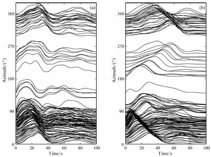 依赖于方位的视震源时间函数 (a) 来自P波(P波视震源时间函数);(b)来自Rayleigh波(Rayleigh波视震源时间函数). Fig. 2 The azimuth-dependent ASTFs (a) From the P waveform data (the P-ASTFs ); (b) From Rayleigh waveform data (the Rayleigh-ASTFs). |