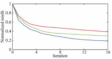 ![]() | 图 5 无噪时不同偏移距参考道反演过程中目标函数收敛速度对比 红色:偏移距750 m参考道;绿色:偏移距600 m参考道;蓝色:0 m偏移距参考道. Fig. 5 The history of normalized misfit functions of 750 m-offset reference trace(red), 600 m-offset reference trace (green) and 0 m-offset reference trace(blue) for noise-free data. |