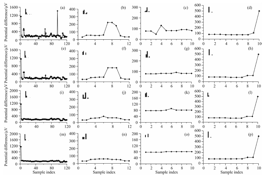 图 14与原始数据样本分布图(图 8)对比,同图 12类似,位于样本中非端点位置出现的异常离群 值,SMF方法能够在不同大小的窗口条件下有效抑制,且随滤波窗口变大,可滤除的脉冲干扰宽度相应增大,但对于样本中有异常值位于样本两端时,无法有效消除,如图 14中的子图(d)、(h)、(l)、(p).图 14与本文方法处理结果样本数据分布图(图 9)对比,本文方法能够在不修改样本数据值的情况下,有效判别并剔除离群异常值,保留分布最为集中的可信的样本结果.