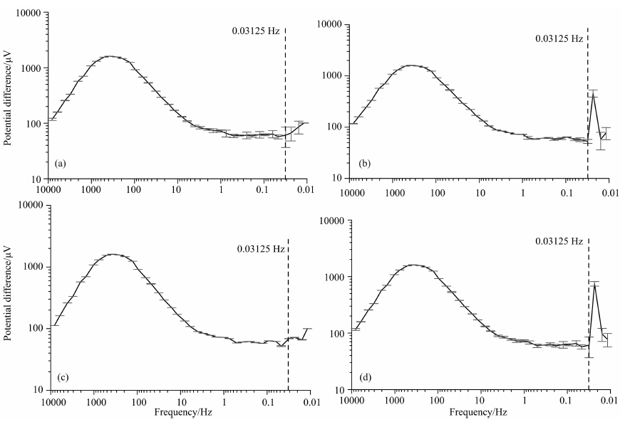 2.5 数据质量评价一般情况下,电磁勘探采集到的原始数据均由仪器设备采集,从信号感应到采样量化等过程无人工干预.为保证原始数据的真实性,在进行数据预处理时,只是剔除粗大误差数据点,而不对样本数据值进行任何修改.数据质量的好坏,可从两个方面综合评价.一是按传统的统计学方法,根据各频点数据样本的相对均方误差大小评价.相对均方误差为均方差与算术均值之比的百分比值(公式(4)),一般而言在10%及以下可以接受,5%及以下为良好.二是在对数坐标系中观察测点的频率数值曲线的形态,一般频率曲线形态变化平缓(即曲线较为平滑)表明数据质量相对较好,如图 2中0.03125 Hz及以上频率,反之,若曲线在某些频点位置有明显波折、上下尖峰或呈锯齿状,则相应频点的数据质量不良,如图 2中0.03125 Hz以下频率.