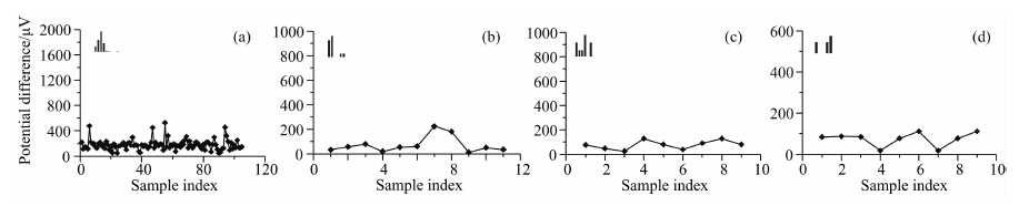 在电磁法勘探中,接收机接收的电场信号中除了有效信号之外,同时还包含大量干扰信号,有效信号幅值往往在微伏级或毫伏级,而干扰信号特别是工业用电所造成的干扰信号幅度却很大,往往在毫伏级甚至达到伏特级,干扰信号的频率范围也非常宽,从直流到几十赫兹甚至上百兆赫兹范围内都存在(蒋奇云,2010),因此,采集到的电磁勘探原始电场数据中往往混有一些偏离均值较大的粗大误差数据.一般采用在每个测点的各个频率点都进行冗余采集,再将剔除粗大误差后的均值作为测量结果的方法来提高采集数据的可靠性和可信度.与传统的精密测量(如机械工件尺寸测量等)不同,电磁勘探采集到的原始数据值的分布范围要比精密测量大得多;尤其在采集低频信号时(0.1 Hz以下),由于信号周期长,野外勘探采集到的原始数据样本集规模(即样本数量)较小;在某些干扰源较多、干扰频率范围较宽以及干扰信号较强的工区勘探时,数据样本 中常常混有较大比例且偏离度较大的粗大误差数据点.