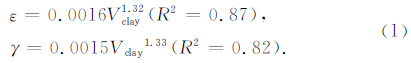 图 6a给出典型页岩样品(粘土含量不同)垂直层理传播时纵波、横波速度随围压的变化关系.可以看出,样品的纵、横波速度都随着有效压力的增加而增大.对于粘土含量较高的两个样品(Vclay=44.3%,Vclay=44.8%),速度-压力曲线在围限压力较低时呈非线性的幂指数增长趋势,而在高压时则表现为单一的线性增长趋势.岩石样品低压力时所表现出的非线性变化趋势主要与样品中微裂隙和粒间孔隙的闭合有关,而高压时的线性增长则和硬孔隙在压力下的闭合或者组成岩石颗粒压缩(“晶格压缩”)有关. 速度-压力曲线说明了高粘土含量页岩样品内部有着纵横比较小的微裂隙. 由扫描电镜观察结果(图 2d)可以发现,页岩样品内部的微裂隙主要由粘土矿物的应力释放和粘土矿物脱水产生,而微裂隙的定向则与粘土的定向具有一致性,造成高粘土含量的样品其纵、横波各向异性随压力的变化也最为明显(图 6b).其余页岩样品的速度随压力的增加表现出近于线性的变化,反映样品中主要包含有机质孔和原生粒间孔这样的纵横比较大的“硬”孔隙. 同时这些低粘土含量的页岩样品各向异性均较小,而且其各向异性参数随压力变化也非常不敏感. 从实验结果还可以发现,粘土含量Vclay=6.5%的页岩样品在围压小于10 MPa的情况下横波各向异性(γ)小于零,不满足VTI介质假设. 由于微裂隙赋存位置和层间结构原因,微裂隙通常与粘土颗粒具有相同的定向特征. 因此,较低的各向异性说明了大多数的粘土矿物的定向是随机的,故而微裂隙也表现为随机定向,造成各向异性随围压变化也较小.当存在多组裂隙定向时,各向异性因子也会表现为小于0的值; 随压力的增大,微裂隙逐渐闭合,各向异性参数也逐渐增大而在压力较高时表现为高于0的值. 图 6c—6d为50 MPa围压下,样品的粘土含量对于各向异性因子ε和γ的影响.可以看出,各向异性随着粘土含量的增加有着明显的增加,表明粘土含量仍然是控制页岩样品各向异性大小的决定因素. 粘土含量与各向异性参数满足如下的经验公式: