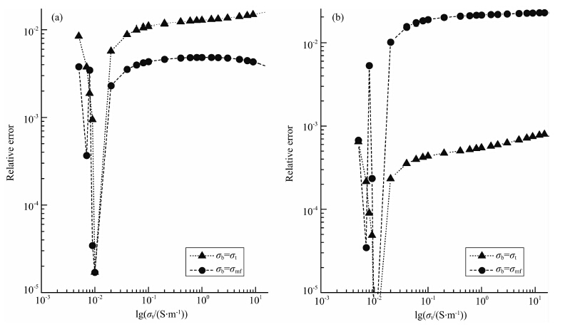 图 4a和b分别给出了短源距和长源距的双线 圈系在淡水泥浆中背景场对有限元计算结果的影响. 其中井径为0.2 m,淡水泥浆电导率σmf=0.01 S/m,无限厚均匀地层的电导率σt=0.005~15 S/m.图中圆圈和三角分别是选用泥浆和地层作为背景场介质计算的相对误差.由图 4可以看到,当地层电导率等于泥浆电导率即介质是均匀时误差等于0,此时有限元计算的结果等同于解析解.短源距时,用泥浆作背景场的计算误差小于地层作背景场的计算误差.长源距时,用泥浆作背景场的计算误差总体要大于用地层作背景场的计算误差.这是因为短源距的线圈系受井眼影响大,源在电导率为泥浆电导率的均匀介质中产生的背景场更接近于总场;长源距线圈系受地层的影响更大,地层背景场更接近于总场.从图中还可以看出,长源距地层背景场的计算误差要小于短源距井眼背景场的计算误差.这是因为即使在短源距情况下,由于井眼半径比较小,泥浆电导率比较低,来自于地层的影响仍然占很大的比重,井眼背景场与总场之间仍然存在着相当大的差异.而在长源距情况下,几乎所有的影响都来自于地层,地层背景场十分接近总场,因而用有限元计算得到更高精度结果.