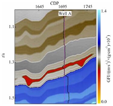 进一步将流体因子直接提取的结果和间接求取的结果进行了对比分析.图 14a为叠后地震剖面,黑色曲线为伽玛测井曲线,粉红色曲线为油水指示曲线,地震反射属于中强度振幅,信噪比较低,很难通过叠后亮点或是分频技术有效的识别含油气性;图 14b为Gassmann流体因子直接提取的结果,图 14c为间接提取的结果,其中白色曲线为伽玛曲线.对于A井,井旁道1.06 s和1.077 s处分别有一个6 m、10 m的油层,1.11 s处有一水层,图 14b的流体因子直接提取结果在这三处都表现为低值,并且油层的流体因子相对于水层的流体因子更低一些.而图 14c的流体因子间接提取结果对于6 m油层的反映并不明显,对于10 m的水层没有反映.