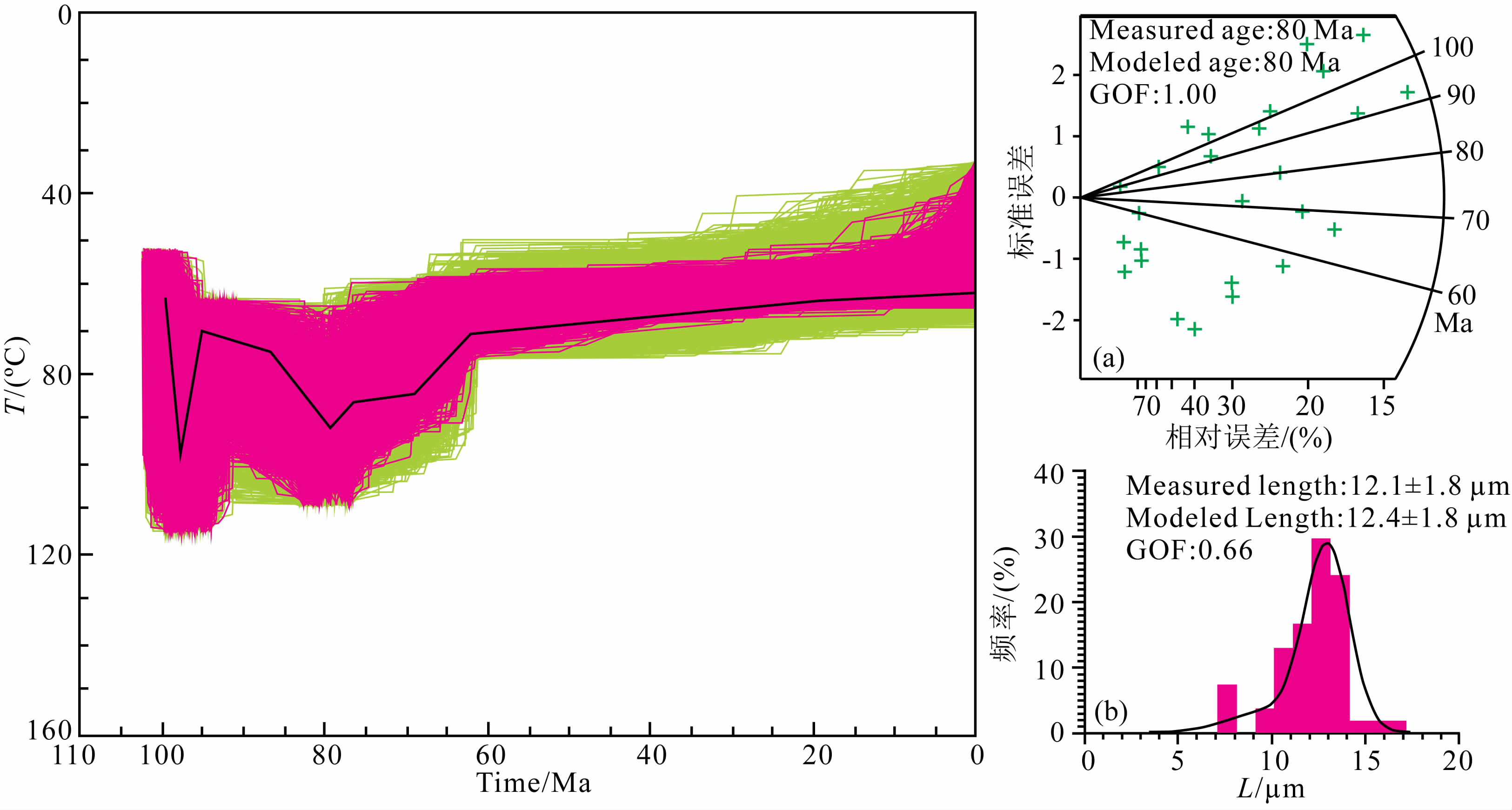 图 5 Y4井(1529.5 m,K1s1)温度-时间演化图 使用Monte Carlo模型模拟了10000条温度-时间路径;可以接受的温度-时间路径有1668条(左图酒绿色线条);好的温度- 时间路径为189条(左图粉红色线条);粗的黑线条为最佳温度-时间路径.(a)裂变径迹年龄分布图;(b)裂变径迹长度分布图, 图中黑线条为模拟的裂变径迹.GOF为拟合度. Fig. 5 Thermal history of sample Y4(1529.5 m,K1s1)in well Y4 Ten thous and thermal paths were tried using the Monte Carlo inverse modeling method;1668 paths are acceptable(wine green lines) and 189 paths are good(pink lines).The thick black line is the best temperature path.(a)Apatite fission-track ages.(b)Apatite fission-track length distribution.The thick black line is modeled Apatite fission-track length.GOF=goodness of fit. |