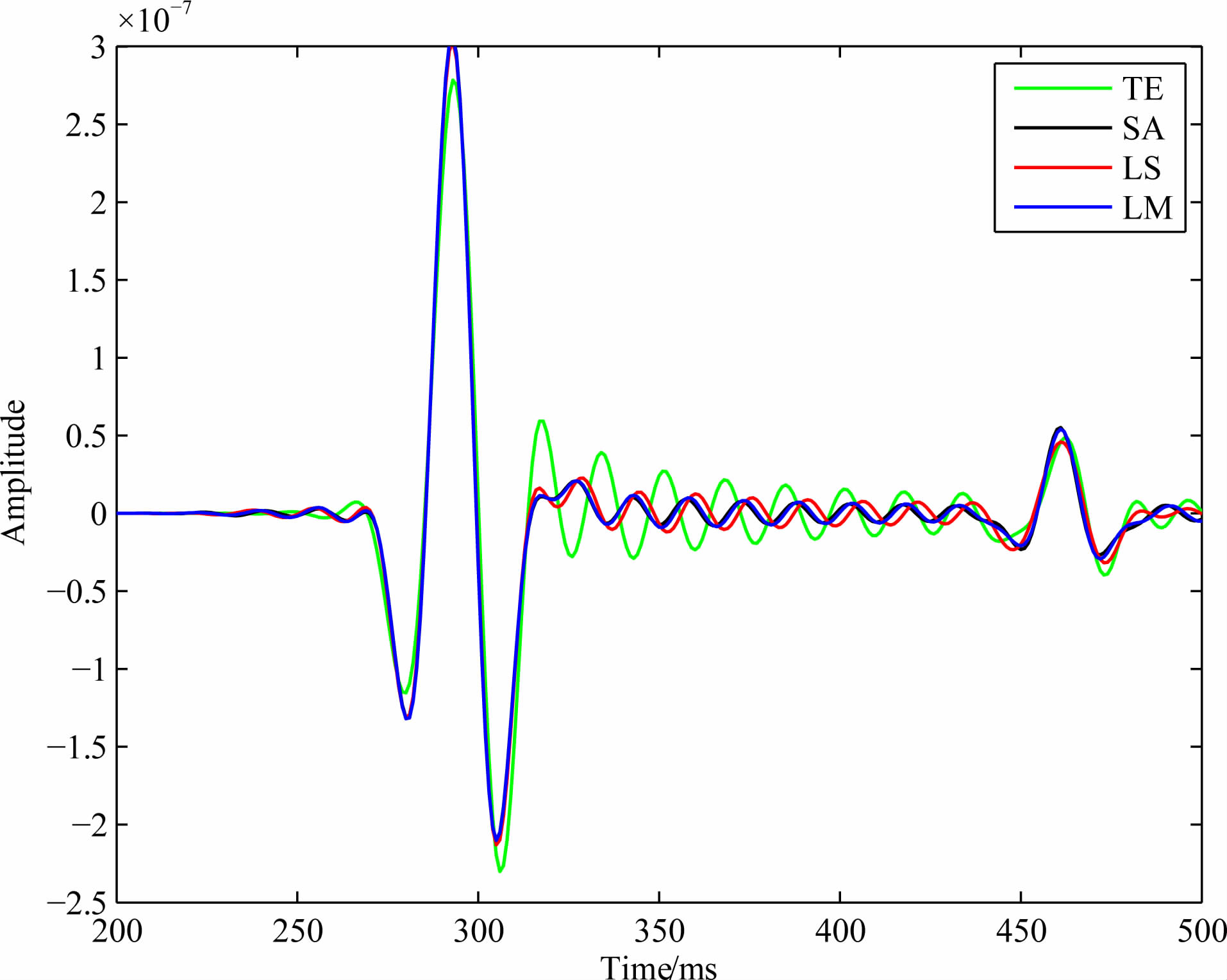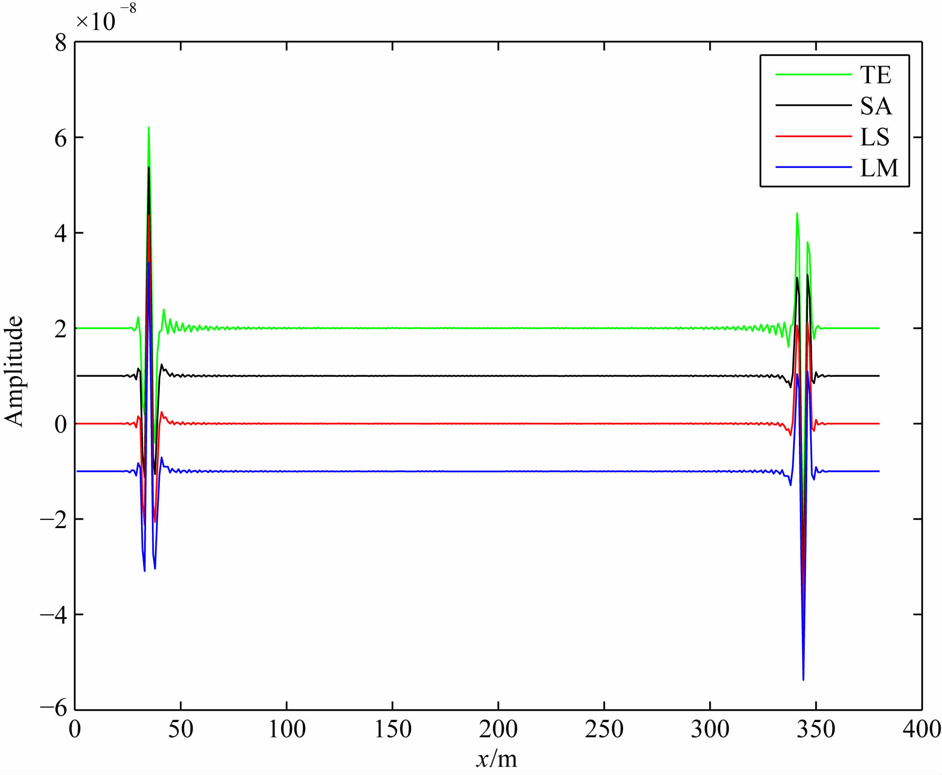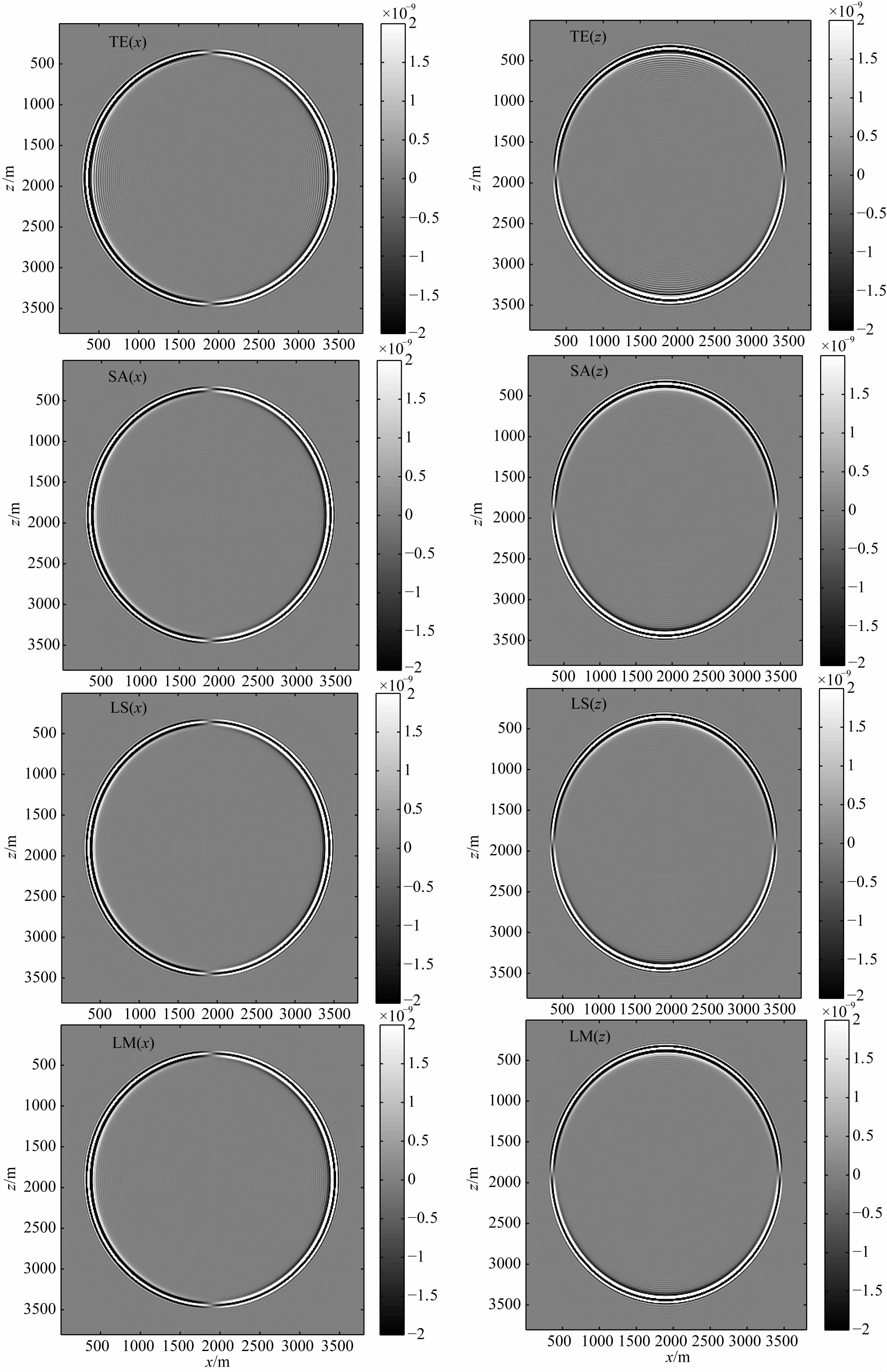 图 6显示了泰勒展开法(TE)、模拟退火方法(SA)、最小二乘方法(LS)和线性化方法(LM)计算有限差分系数的地震记录.图 6a是泰勒展开法差分格式的地震记录,数值频散明显;图 6(b-d)分别是 用优化方法和线性化方法有限差分系数得到的x方向的地震记录.可以看出,数值频散得到了明显的压制.