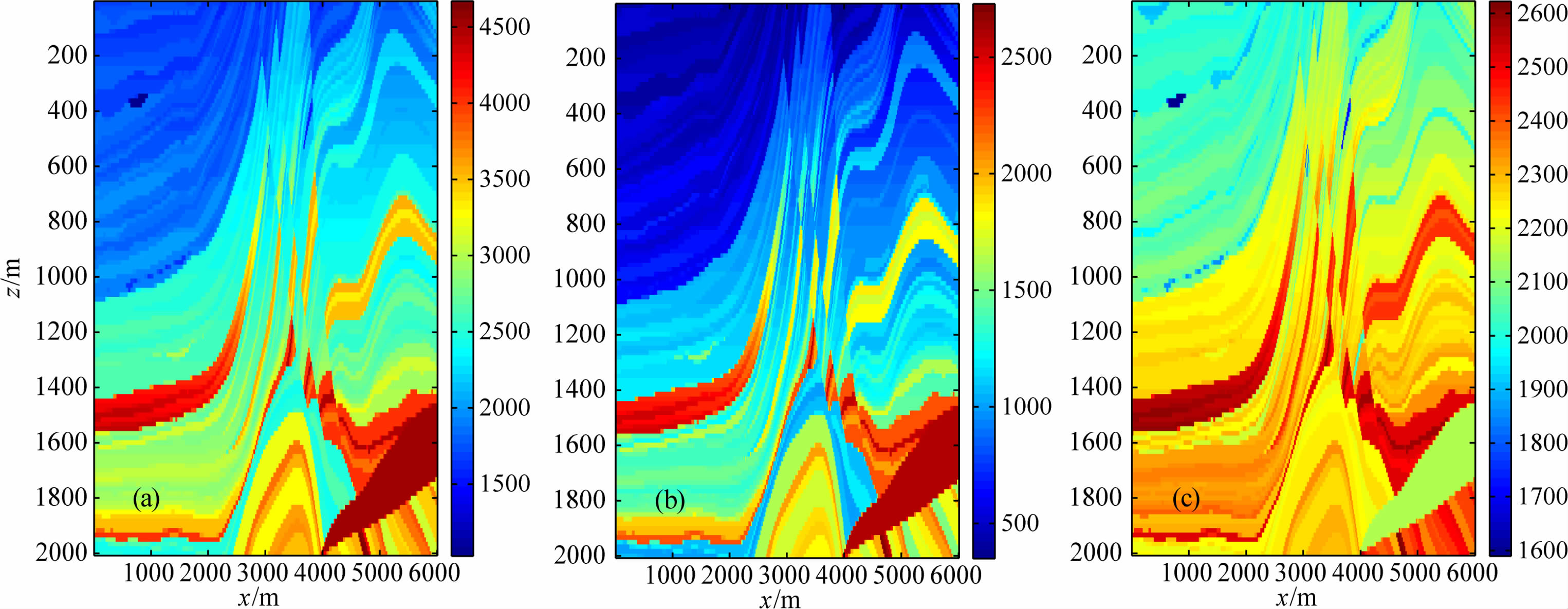图 5 Marmousi速度模型(a) P波;(b) S波;(c) 密度. Fig. 5 Marmousi velocity model (a) P waves;(b) S waves;(c) Density. |