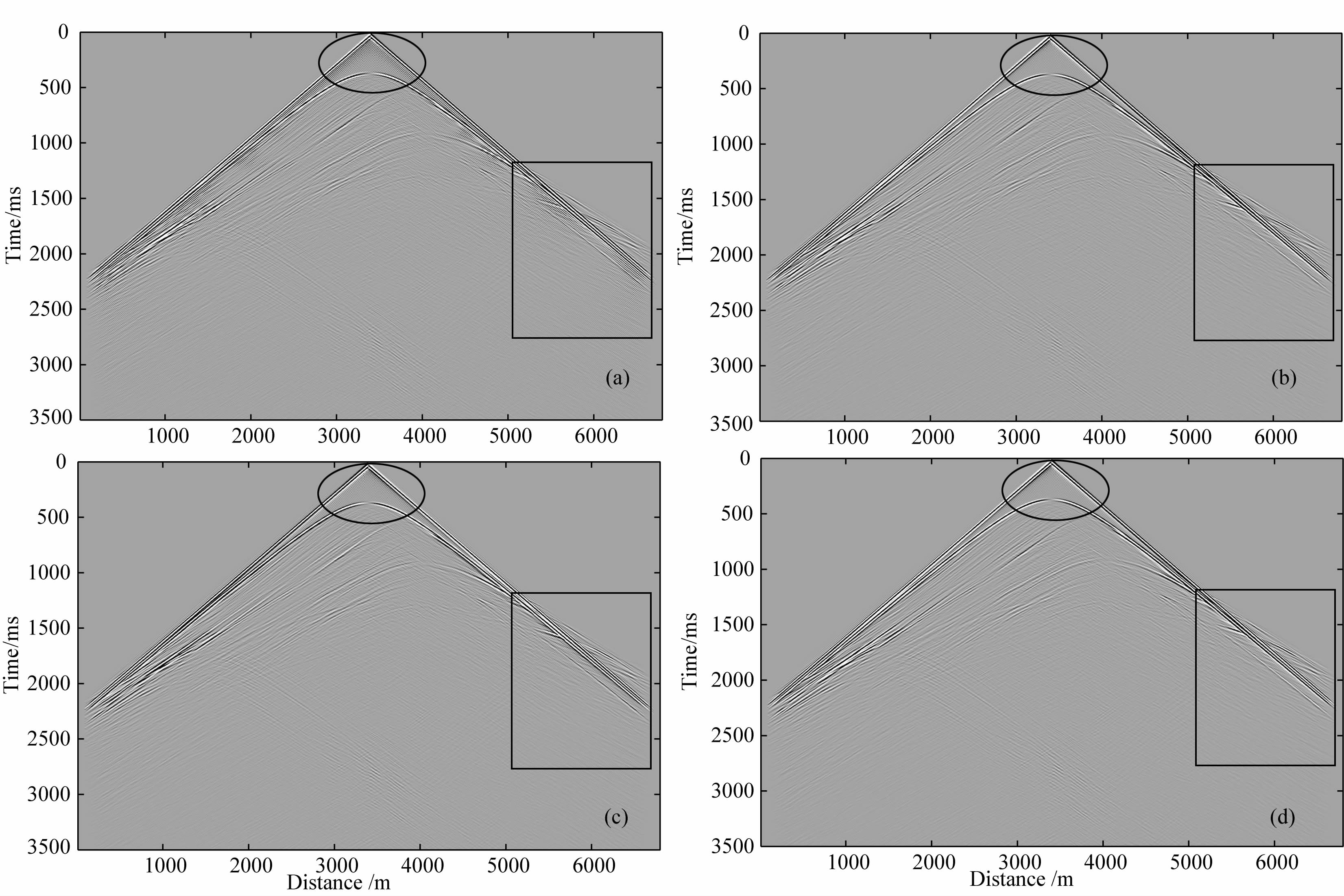 图 6 不同有限差分系数算法模拟得到的Marmousi模型的地震记录(a)泰勒展开方法(TE);(b)模拟退火算法(SA);(c)最小二乘方法(LS); (d)线性方法(LM) Fig. 6 Seismic records of the Marmousi model using different FD coefficient determination methods (a) Taylor method (TE); (b) Simulated annealing algorithm (SA); (c) Least squares method (LS); (d) The linear method (LM) |