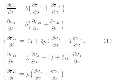 其中,t 为时间,x和z 为空间变量,(vx,vz)是速度向量,(τxx,τzz,τxz)是应力向量,λ(x,z)和μ(x,z)是Lamé系数,b=b(x,z)是密度的倒数.求解方程(1),通常时间方向采用二阶差分格式,空间方向采用高阶差分格式.
