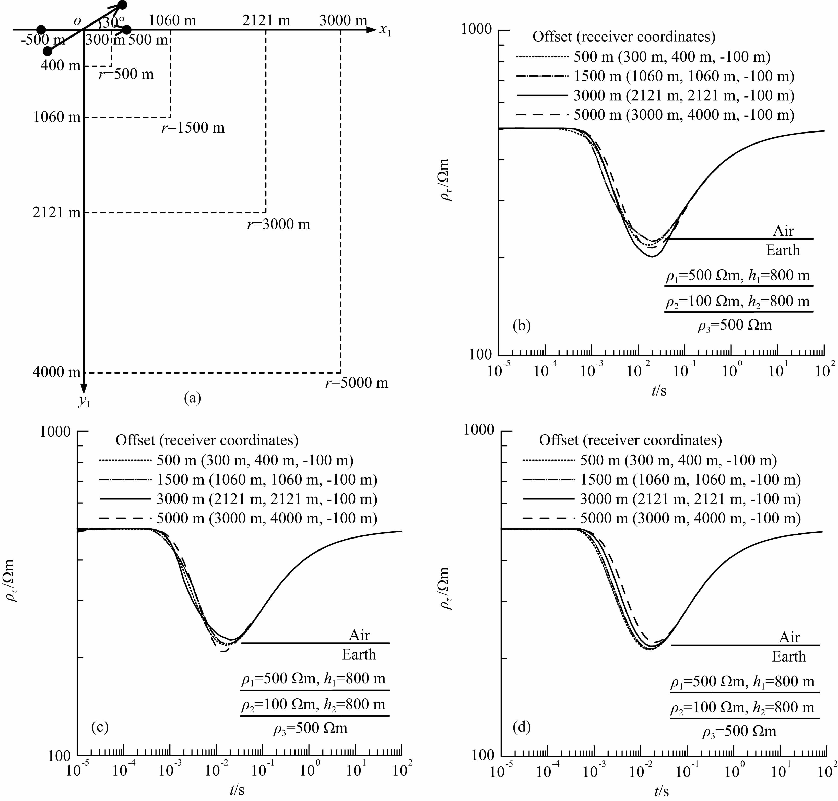 为了说明偏移距对多辐射源地空系统全域视电阻率的影响,设计了如下模型:源1、2的长度均为1000 m,电流方向如图中箭头所示,两源之间的夹角为30°,电流大小均为500 A,观测点位于飞行高 度100 m处,距离源1的偏移距分别为500 m、1500 m、3000 m和5000 m,在x1 y1 z1坐标系中对应的坐标分别为(300 m,400 m,-100 m),(1060 m,1060 m,-100 m),(2121 m,2121 m,-100 m)和(3000 m,4000 m,-100 m),三层模型的电阻率ρ1=500 Ωm,ρ2=100 Ωm,ρ3=500 Ωm,层厚h1=800 m,h2=800 m. 从图 9中可以看出,全域视电阻率定义方法同时适用于大偏移距和小偏移距,曲线均能完整渐变光滑地反映出地下的电性信息变化,在早期和晚期分别趋近于模型的首层和底层电阻率,解决了多辐射场源地空系统视电阻率定义距离上不分远近的问题,且通过比较可以看出偏移距变化对各分量视电阻率曲线的分异均较小.