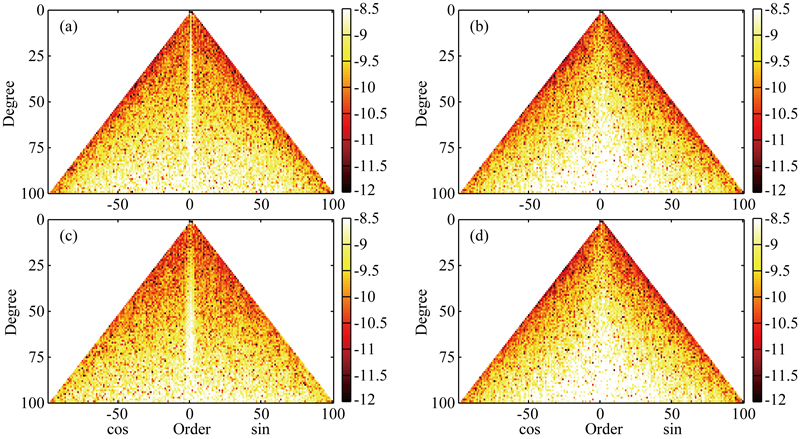 ![]() | 图 1 IRF下各种解的位系数误差谱(a) X方向; (b) Y方向; (c)Z方向; (d)等权联合解.Fig. 1 Coefficient error spectrum in IRF(a)—(c) Solutions solely derived from X, Y, Z component respectively; (d) Solution derived from the combination of three components with equal weight |