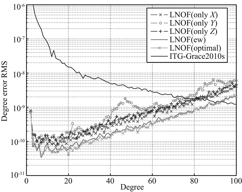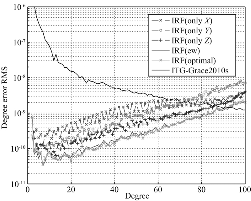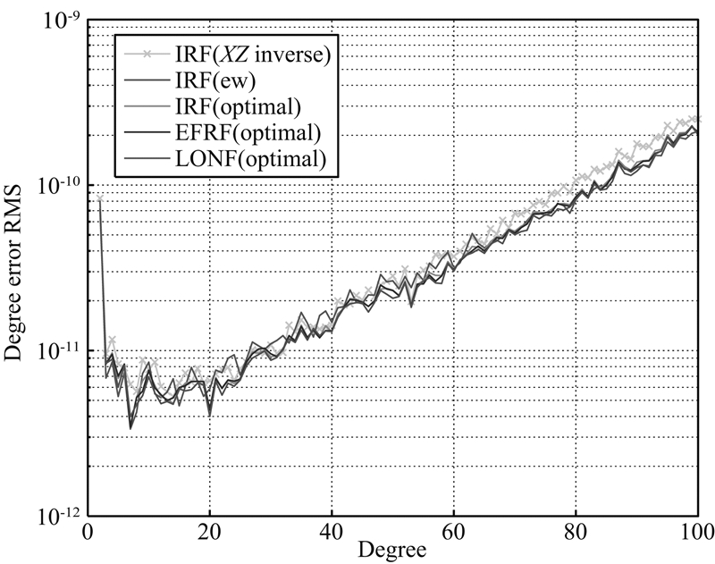由图 2可知,在IRF下仅使用X方向观测值得到的解算模型的阶误差RMS最大,根据误差传播定律,理论上应该减少该方向的权值;而由表 2可知,IRF系下的X方向权比为42.0%,即基于公式(6)的联合处理方式对X方向观测值做了升权处理.为检验本文加权的合理性,在解算中将表 2中IRF系下X方向和Z方向的权比互换,即对X方向做降权处理,对Z方向做升权处理,得到的解算模型精度如图 8中IRF(XZ inverse)所示.采用该联合解算方式得到的精度不但低于加权联合解,在高阶次还不及等权联合解.根据上述讨论,基于公式(6)的联合解,不仅考虑了各个方向独立解的精度,还考虑了各个方向观测值之间的相互关系.因此,在后续研究中建议均采用本文的加权联合解算方式;而在GOCE HL-SST反演中,则建议在LNOF下实现加权联合解算.