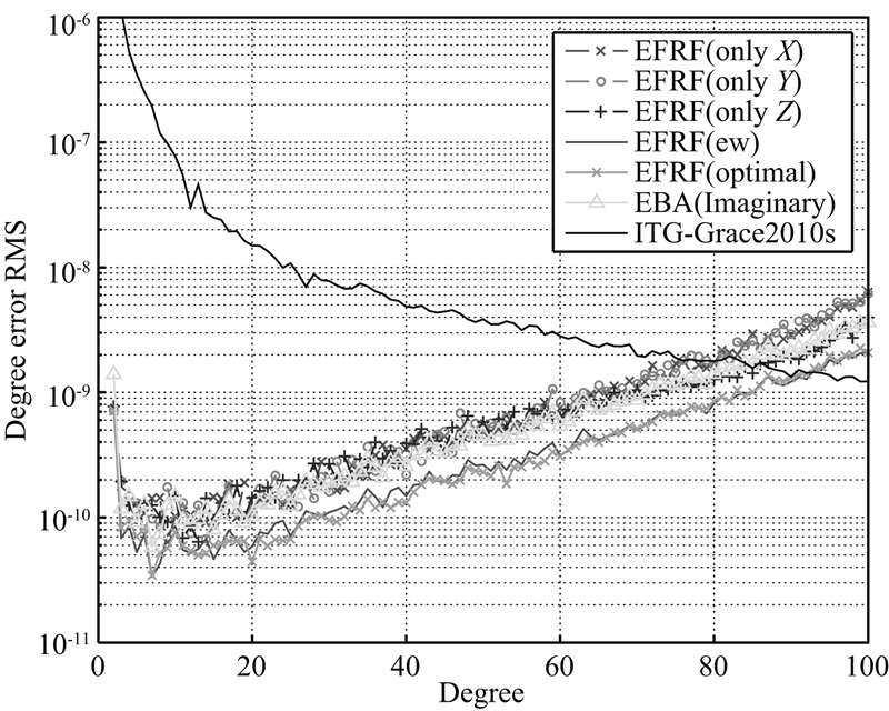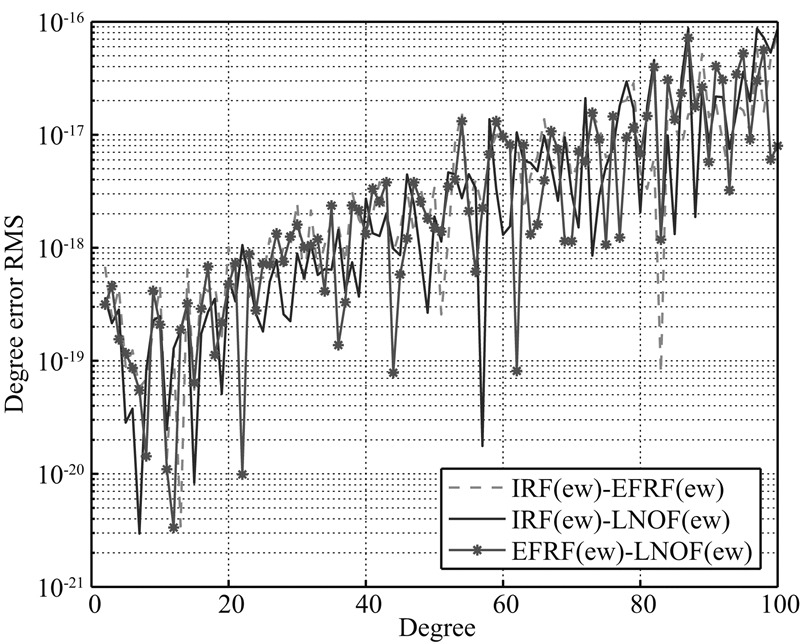 为了便于比较不同坐标系下顾及各个方向观测值权比的联合解精度,图 8给出了三种坐标系下加权联合解的阶误差RMS.不同于等权联合解,加权联合解在不同坐标系下的精度各不相同:在前10阶和70阶次之后,三种坐标系下的联合解与等权解的精度相当;在10至70阶次,EFRF与IRF下的加权联合精度几乎一致,只有在极少数阶次略优;而在10至70阶次,LNOF下的加权联合解精度略优于EFRF和IRF下的联合解精度.