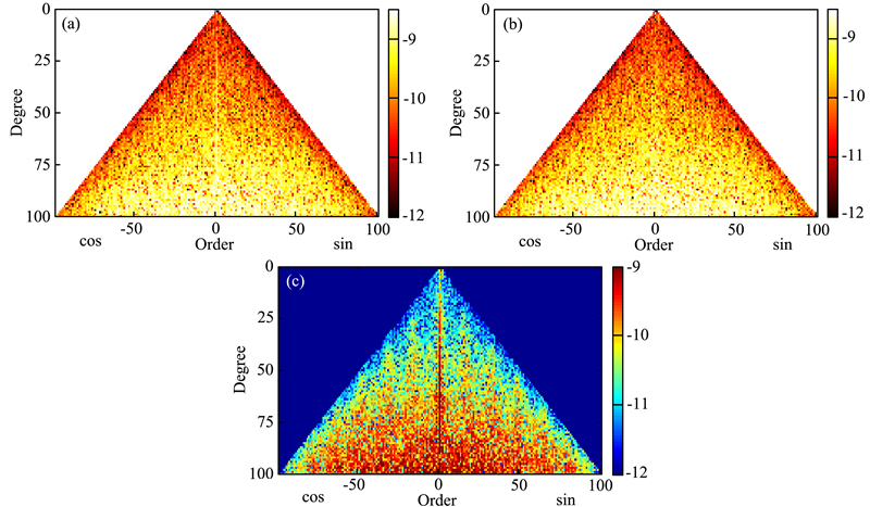 ![]() | 图 5 LNOF下各种解的位系数误差谱(a)等权;(b)加权;(c)二者之差.Fig. 5 Coefficient error spectrum in LNOF(a)—(b) Solutions derived from the combination of three components with equal weight and different weight respectively; (c) Differences of these two solutions. |