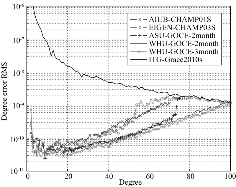 ASU-GOCE-2months模型是Bezděk等(2014)基于加速度法计算的重力场模型,计算中采用了2009年11月至12月共计两个月的GOCE HL-SST数据,截断阶次为75.对比采用同时期观测数据计算得到的WHU-GOCE-2months模型可知,二者在前60阶的阶误差RMS趋于一致;采用本文顾及多方向观测权比的动力积分法,60阶之后的WHU-GOCE-2months模型优于加速度法解算的ASU-GOCE-2months模型.此外,对比分别采用2个月和3个月观测数据得到的WHU-GOCE-2months和WHU-GOCE-3months可知,在观测精度一致的前提下,增加多余观测可有效提升解算精度.根据上述讨论,采用共计4年的GOCE HL-SST观测数据,解算精度有望实现全频段提升.