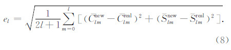 >的阶误差RMS(Root Mean Square)el,以评估反演结果的解算精度(钟波,2010).考虑到ITG-Grace2010s模型为纯GRACE卫星重力场模型,不包含GOCE卫星观测信息且在中低阶次解算精度较高,在后文的精度评定中,均取该模型为“真实重力场模型”.