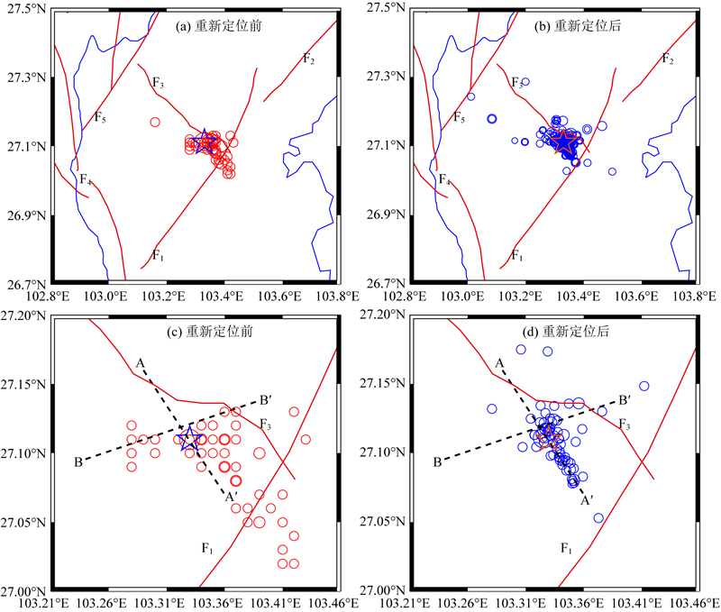 图 2为重新定位前后的地震震中分布图,对比图 2a和图 2b可以看出,重新定位的地震震中空间分布比重新定位前地震的空间分布更加向主震集中,重新定位前余震活动已经穿过西鱼河—昭通断裂,重新定位的结果显示余震主要分布在西鱼河—昭通断裂以西,似乎并未穿过它.