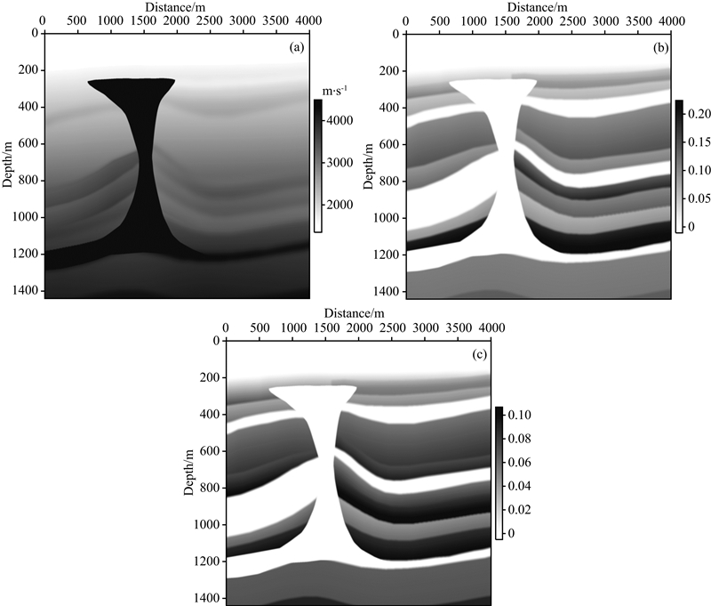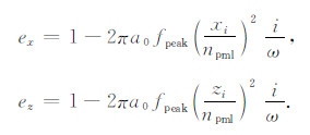 其中fpeak是震源主频,xi和zi分别为PML区域内部点与边界的x方向和z方向的距离,npml为PML层厚度,a0取经验值1.79(吴国忱等,2007).