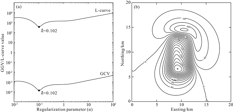![]() | 图 3 正则参数曲线(a)与向下延拓结果(b)Fig. 3 The regularization parameter curves (a) and corresponding evaluated regularized solution of downward continuation (b) |