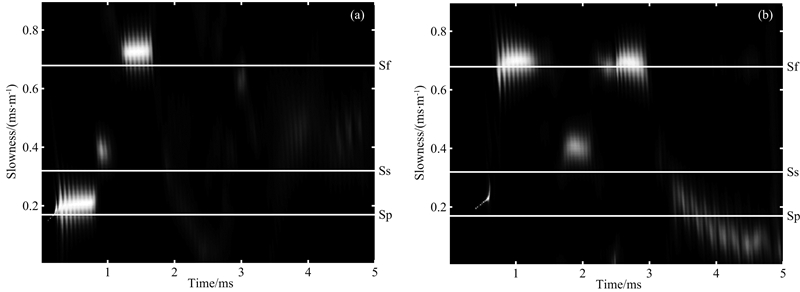 ![]() | 图 10 STC处理图9中波场的时间慢度图 (a) 1.8~2.88 m上行波场的时间慢度图; (b) 3.72~4.2 m波场的时间慢度图. Fig. 10 Semblance plots for the waveforms in Fig.9 (a) Time-slowness diagram for the up-going waves between 1.8 m and 2.88 m; (b) Time-slowness diagram for the waves between 3.72 m and 4.2 m. |
