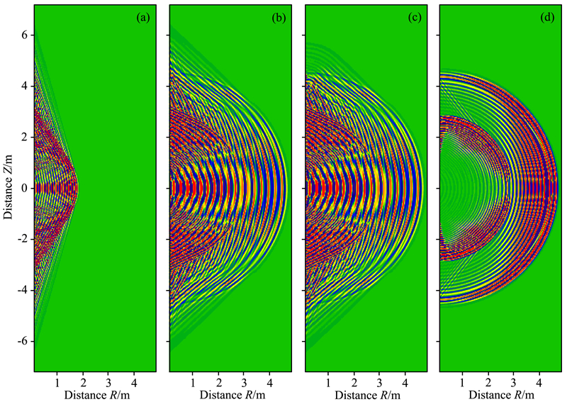![]() | 图 13 声源中心频率为24 kHz时,四种模型在1.2 ms时刻的地层波场快照 (a) 钻铤置于无限大流体介质; (b) 随钻声波测井; (c) 钻铤端部截断的随钻声波测井; (d) 电缆测井. Fig. 13 Snapshots at 1.2 ms of the wave fields for the four models with a 24.0 kHz monopole source (a) The drill collar locates in a infinite fluid; (b) Acoustic LWD; (c) The drill collar cuts off at the end; (d) Acoustic logging. |