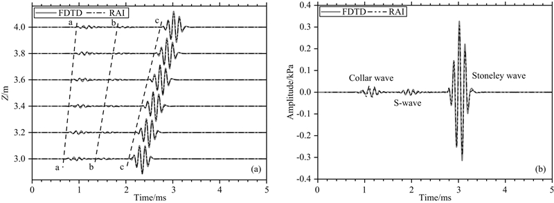 ![]() | 图 3 硬地层中FDTD和RAI模拟的随钻声波测井全波对比图 (a) 源距3.0~4.0 m的归一化波形; (b)源距4.0 m的波形. Fig. 3 Comparison between the waveforms simulated by FDTD and RAI of the acoustic LWD for a fast formation (a) Normalized full-waveforms from 3.0 m to 4.0 m (b) Full waveforms at 4.0 m. |