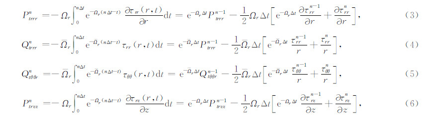 式中,上标n为时间节点编号,下标j和k分别为空间网格沿径向和轴向的编号,Δt为时间步长,变量Ptrrrn,Qtrrrn,Ptθθrn和Ptrzzn为卷积积分项,可由梯形公式近似表示如下: