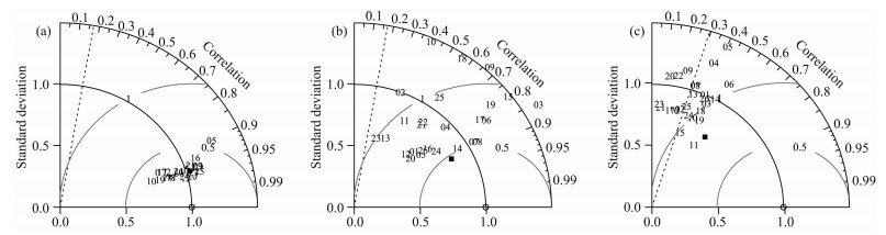 图 1 在参照时段1961—2005年,东北三省模拟场相对于观测场的泰勒图:(a)气温空间分布;(b)降水空间分布;(c)气温时间序列.实心正方形为模式集合,横轴上的圆点表示观测 Fig. 1 Taylor diagram for displaying the statistics of spatial distributions of 45-year (1961—2005) mean (a) surface air temperature, (b) precipitation and (c) temporal variability of regionally averaged surface air temperature in Northeast China. The solid square represents MME and observation is considered as the point in abscissa axis |