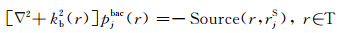 其中∇2表示Laplace算子,pj(r)表示总波场,j为地表不同位置炮点的标号, Source(r, rjs)表示震源项,rjs表示震源位置,T表示地下半空间,k(r)为复波数,公式为