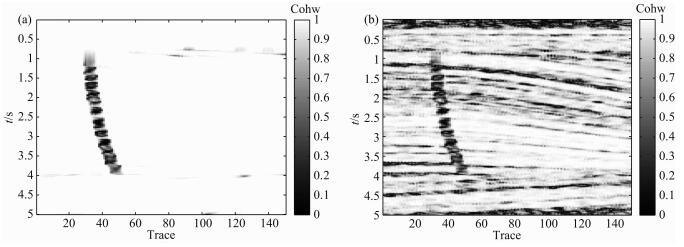 图 3 理论地震数据的加权一致性 (a) 图 1a的加权一致性结果;(b) 图 1b的加权一致性结果. Fig. 3 Weighted coherence of synthetic seismic data (a) Weighted coherence for Fig. 1a; (b) Weighted coherence for Fig. 1b. |
